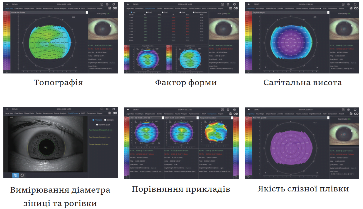 Сагітальне викривлення, Тангенціальна кривизна, Карта висот, Сила заломлення, Сагітальна висота, Якість слізної плівки