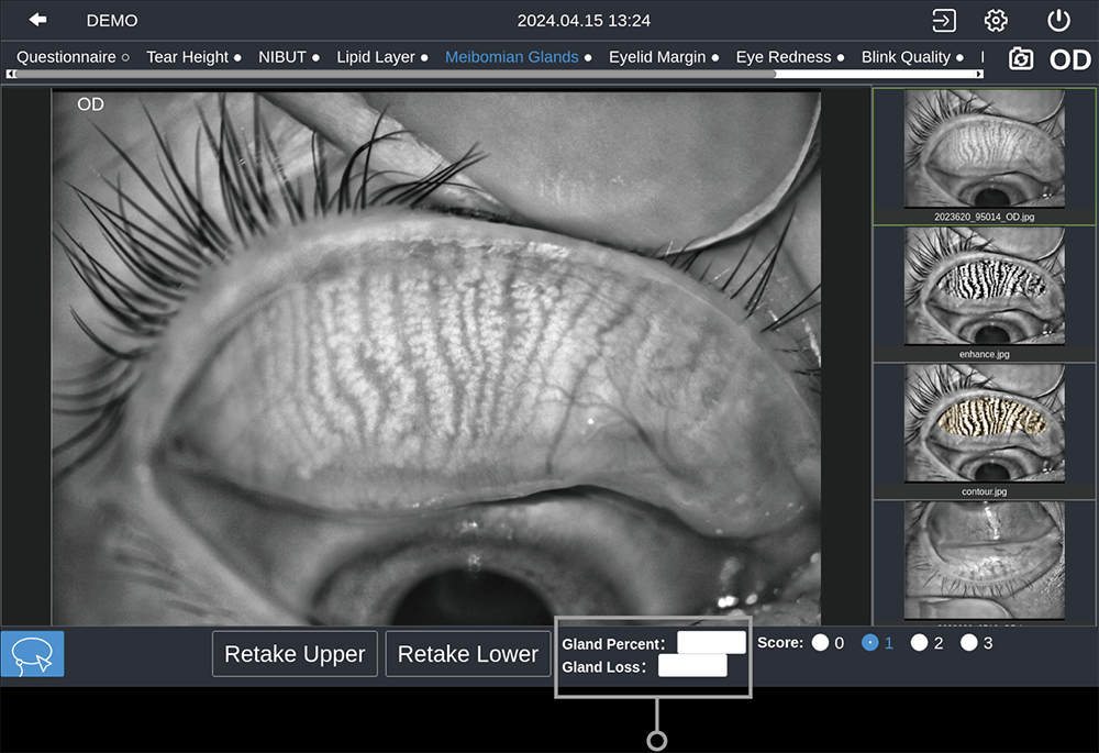 Оцінка мейбомієвих залоз, аналіз почервоніння кон'юнктиви, товщина ліпідного шару, якість моргання, час неінвазивного руйнування слізної плівки, неінвазивна висота слізного меніска