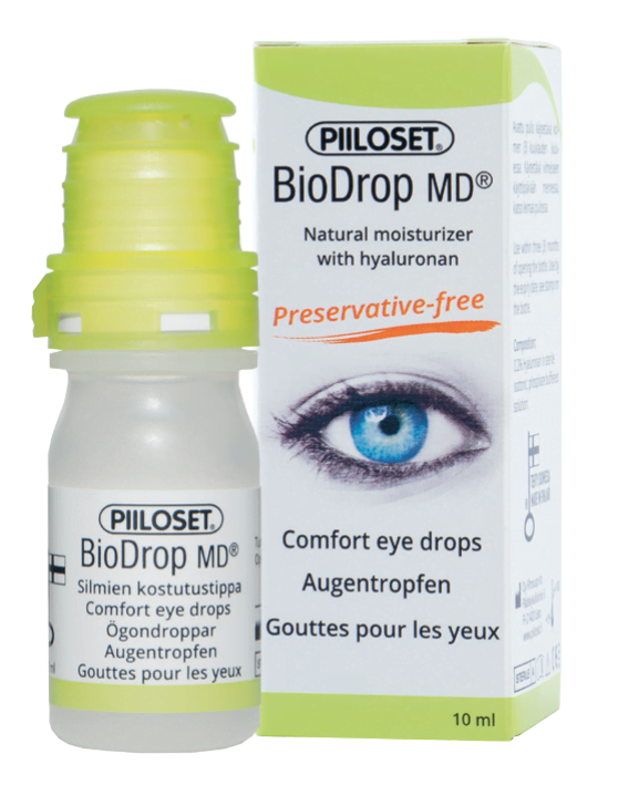 Piiloset BioDrop MD —  розроблені для догляду за сухими та чутливими очима. Завдяки натуральному зволожувальному компоненту - гіалуронату, вони ефективно усувають симптоми сухості очей, захищають епітелій рогівки та сприяють її швидкому загоєнню.