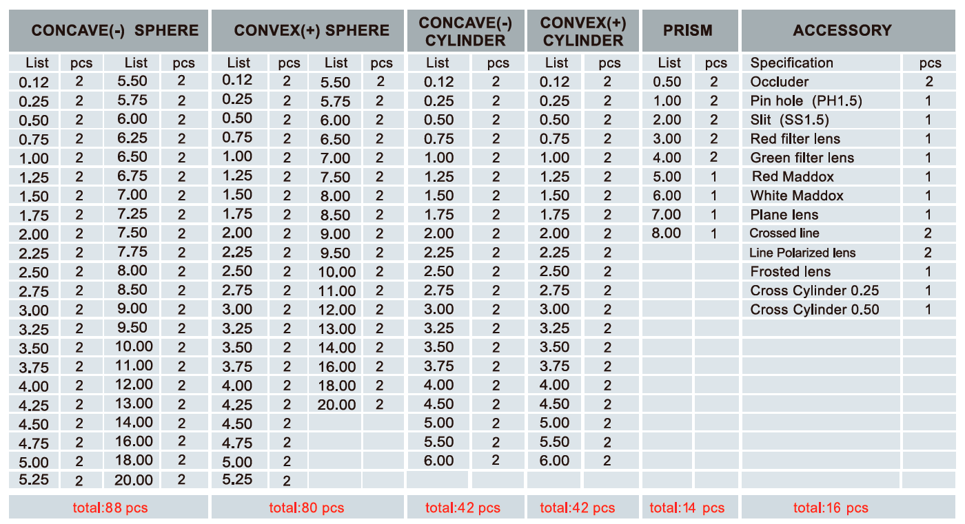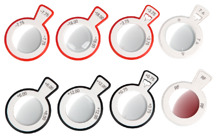 Maddox білий, maddox червоний, хрест вигравіруваний на склі(2), отвір для штифта(2), оклюдер(2), щілина, червоний фільтр, зелений фільтр, схрещений циліндр, скло з показником 0D, крос циліндр(0,25), крос циліндр(0,50)